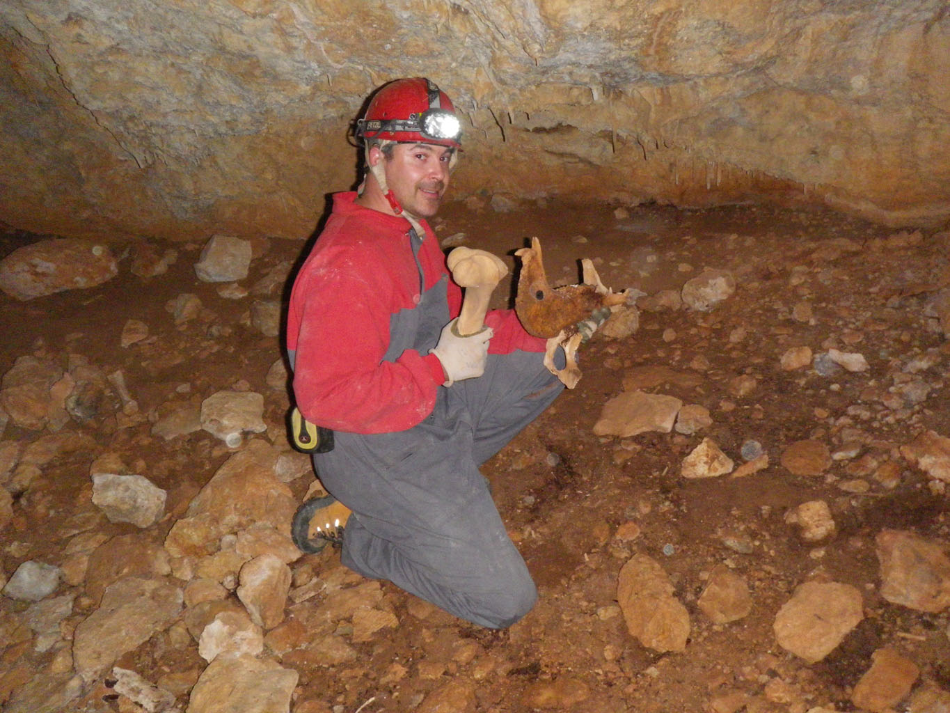 A la altura del salto, entre una oquedad también hay restos óseos y un cráneo en perfecto estado de conservación. Cavidad infectada de arañas y múltiples formaciones.