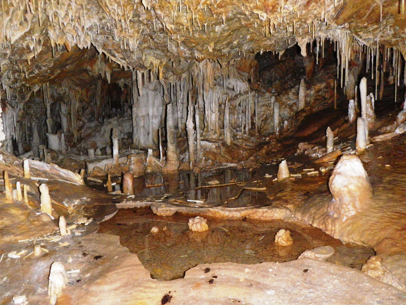 Se compone de varias zonas; la parte alta esta llena de tierra y polvo, como montones dejados por camiones, techo bajo y resquebradizo en su extremo final, cambio radical. Coladas y formaciones múltiples y cientos de excéntricas. La parte central de la sala es de techo más alto, en el centro tierra y polvo, a su derecha un caos de piedras y derrumbe, a la izquierda, roca madre y colada con una enorme fractura con un pequeño paseo que sirve para el discurrir del agua. Y un poco más abajo a la derecha pasando por la cortina de columnatas otra sala impresionante con un laguito. La parte baja, paso difícil por su estrechez, es otra maravilla, aparte de las ingentes formaciones, por sus curiosas formaciones en la parte que se une el techo con el suelo.