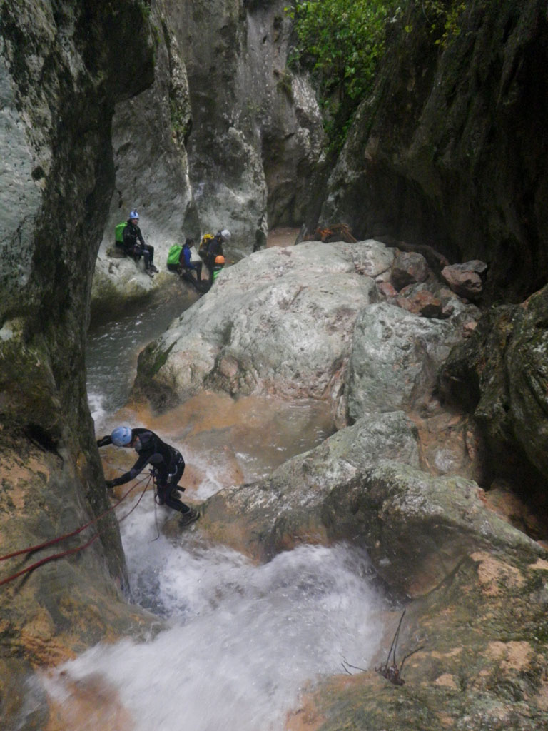 Muchos barranquistas, unos bajando y otros subiendo, así evitan el tener que hacerlo por el camino. Barranco preparado para su remonte sin problemas.