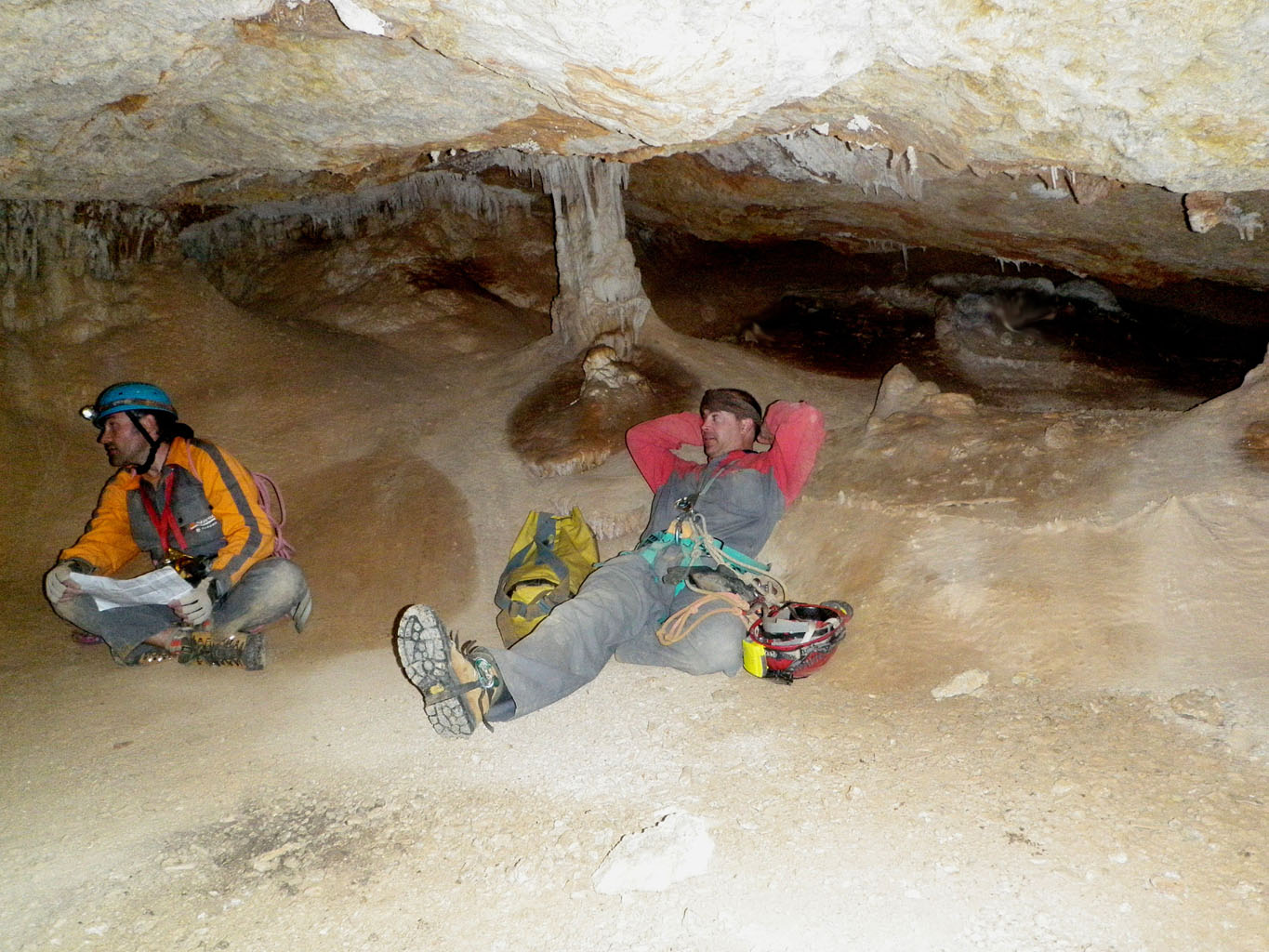 Hora de descansar mientras buscan. Ëxito a medias, encuentran nueva sala y así, medio investigando descienden y descienden, afortunadamente se quedan sin cuerda, que si no…. hasta mañana por aquí. Sobre las 22h llegamos al vehículo y me pongo a calentar la cena con mi súper hornillo, eso sí, una vez plegadas las cuerdas y material vario. Todos dispuestos a volver a casa agotados y yo cenado.
