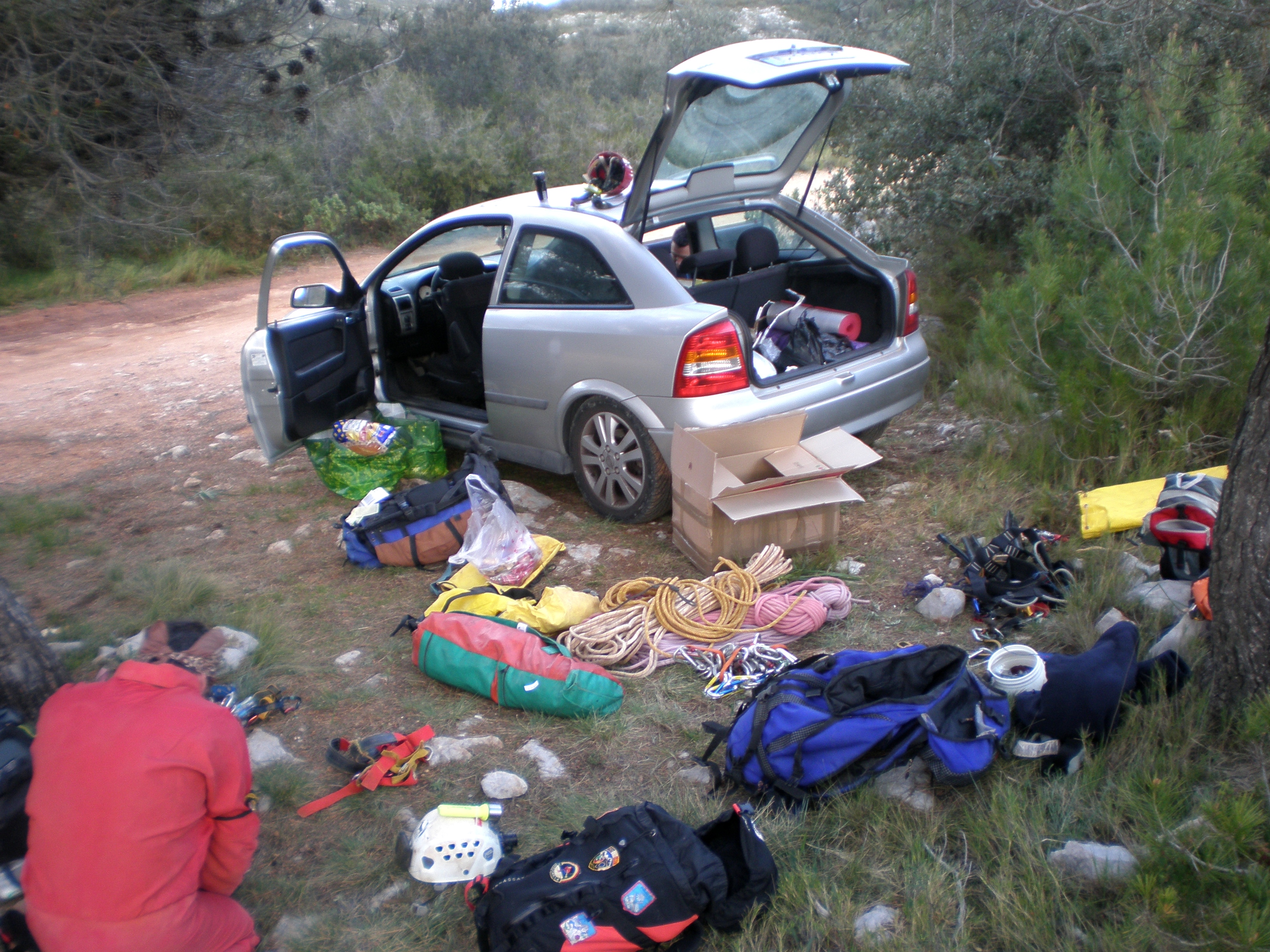 Sorpresa agradable al abrir el maletero del vehículo en el aeropuerto de Alicante, ahí tenemos nuestros paquetes, una caja enorme con todo el material de exploración; más de 300 metros de cuerda, cincuenta y pico de mosquetones con chapas, otros sin chapa, cintas, protectores, 6 sacas, equipo de progresión individual y colectivo y alguna burrada más de peso metálico, al lado, tenemos el paquete si no más importante, sí necesario, la tienda de dormir, que una madruga el vendaval casi nos manda al otro barrio con ella incluida.