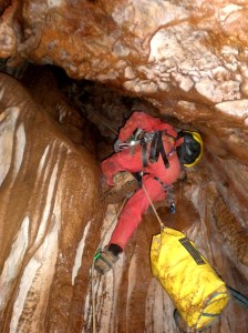 Primer pozo que se abre al momento, poniendo un spit en la pared de enfrente para evitar rozamiento, -Uf… ya empezamos, los spits no están en su mejor momento, me cuesta apretar. Llego a una gran sala rectangular, con posibilidad de dos vías, escogemos la más común o transitada. Llegan los fenómenos, ahora toca descender por un pocete justo a nuestros pies, fraccionamos en una columna y para abajo unos metros, aquí está húmedo. Recibidos por una sala más pequeña. Según los papeles tenemos que tirar hacia la izquierda escalando una colada unos metros, en lo alto encontramos otro pocete más estrecho que luego se ensancha. –Esto mola. Un paripé con la cuerda y Vicente asegurándome, por si las moscas.
