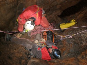 Ascenso, sin prisa pero sin pausa. Yo de primero, seguido del menda de Tomás y Vicente desinstalando. Nos reunimos en la base del P-85. Soy claro y tajante. –Subo la cuerda colgada del arnés, nada dentro de la saca, que me es más pesado. De ésta manera confirmamos que el P-85 en realidad es un P-60. Al llegar a la cabecera del pozo, Tomás y Vicente, me gritan que la cuerda se ha levantado un metro del suelo. ¿Cómo es posible?. Claro, por eso creían que yo no ascendía.
