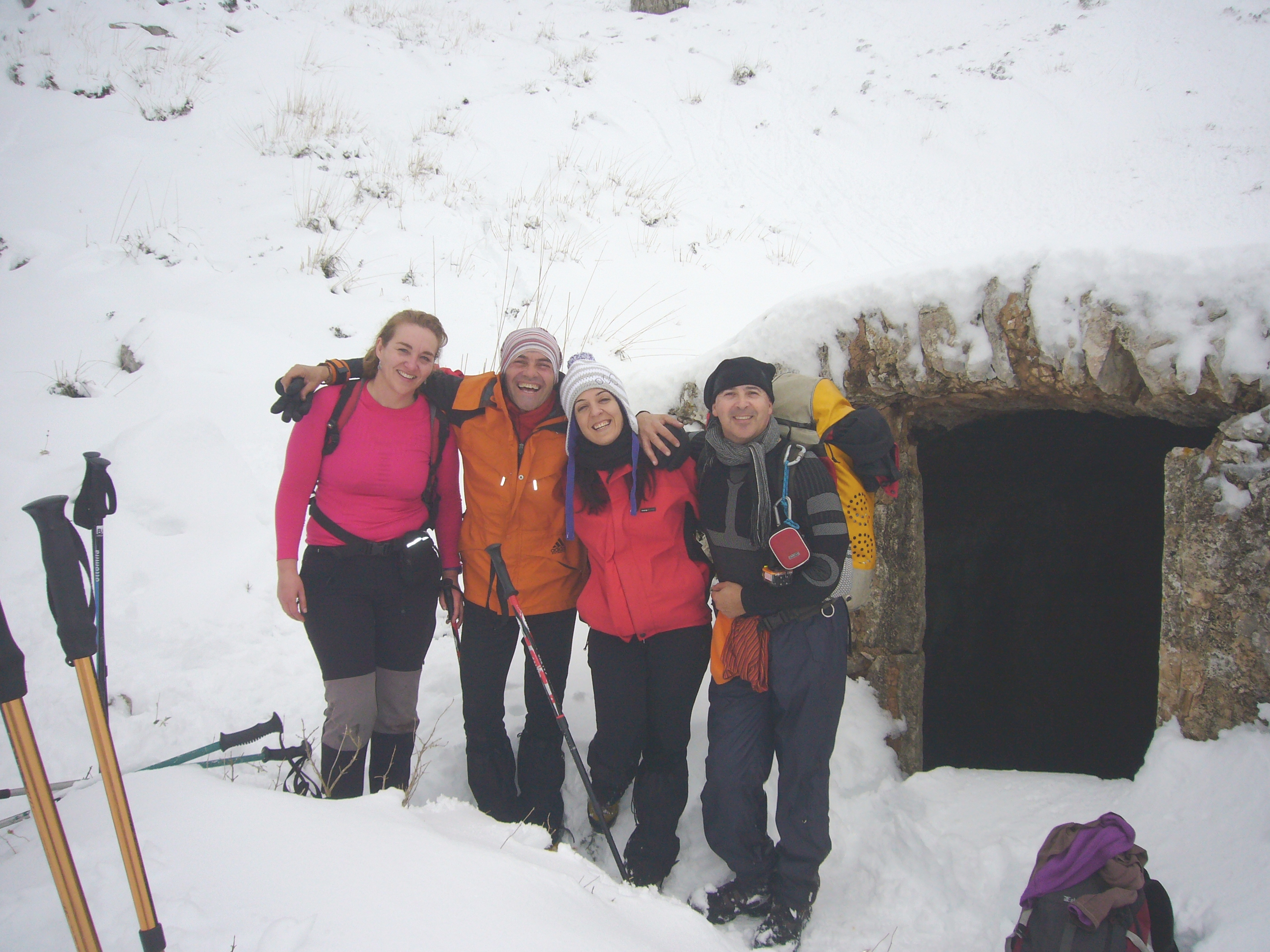 Pasan las horas, es hora por nuestra parte emprender regreso, ya nos encontraremos todos en los coches. Bajan otros montañeros y les preguntamos por el trío, -Sí, los hemos visto, aún les queda un poco para hacer cima. -Ok, gracias. Pues nada, para abajo poc a poc, tira a tira. Fotos, bolazos, abrazos, risas…. Pilar y yo llegamos a los vehículos y vemos a Félix y a Teresa. Intercambiamos experiencias y no a mucho, aparece el trío puntero emocionados, Laura está que se sale. Tarazaga, quiere hacer otra cima mañana, aprovechar la nieve, Laura se apunta. Nosotros haremos un avenc sencillo para las primeras prácticas de Teresa. Y ahora, directos al bar a tomar algo frío y unos platos de frito, uummm… qué bueno, qué ganas…