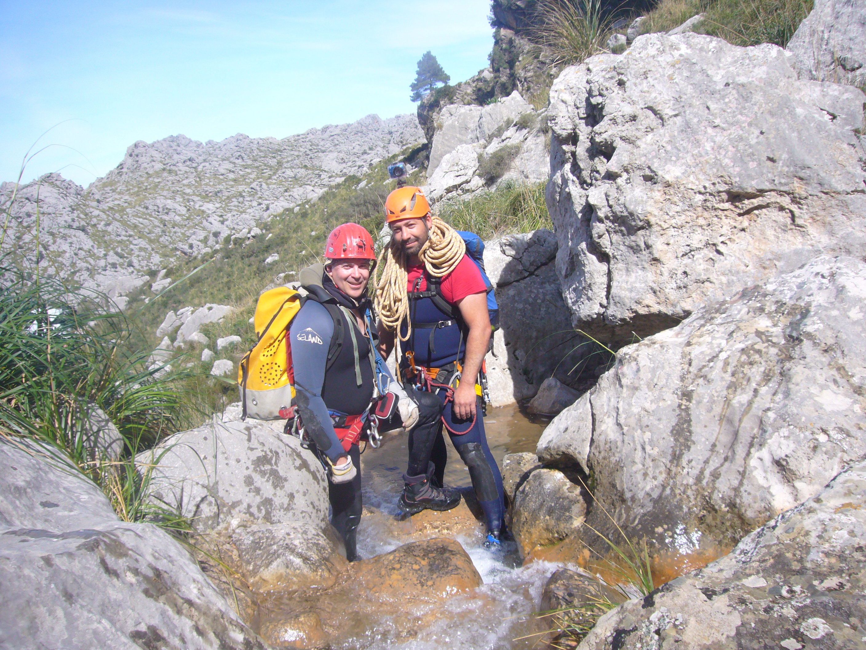Hacemos un montante de vehículos, dos en cala Tuent y otro en es Funicular, eso nos lleva mucho tiempo. Emprendemos andadura dura hasta el Sementer des Coll, seguimos por el sendero que nos lleva hasta la posesión de Bini Gran, y de ahí al inicio del torrente, próximo a Bini Petit. Nos emocionamos al ver «semejantes» rebuznando y relinchando en el lecho del torrente terrorífico y mortal.