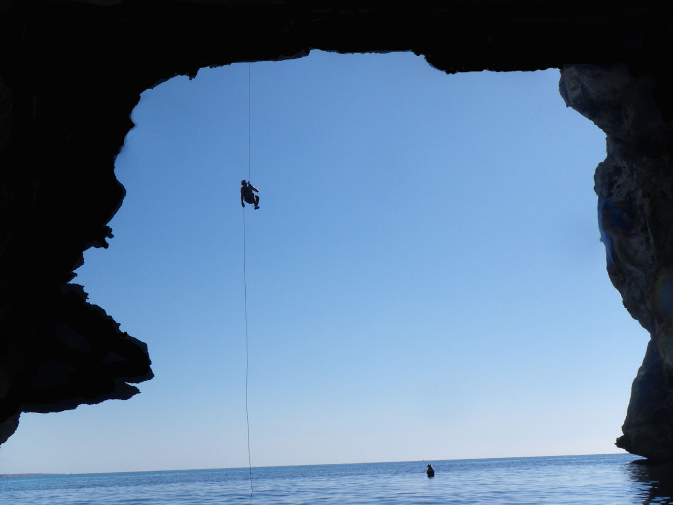 Vista de la inmensa boca del avenc y parte del descenso a sus entrañas